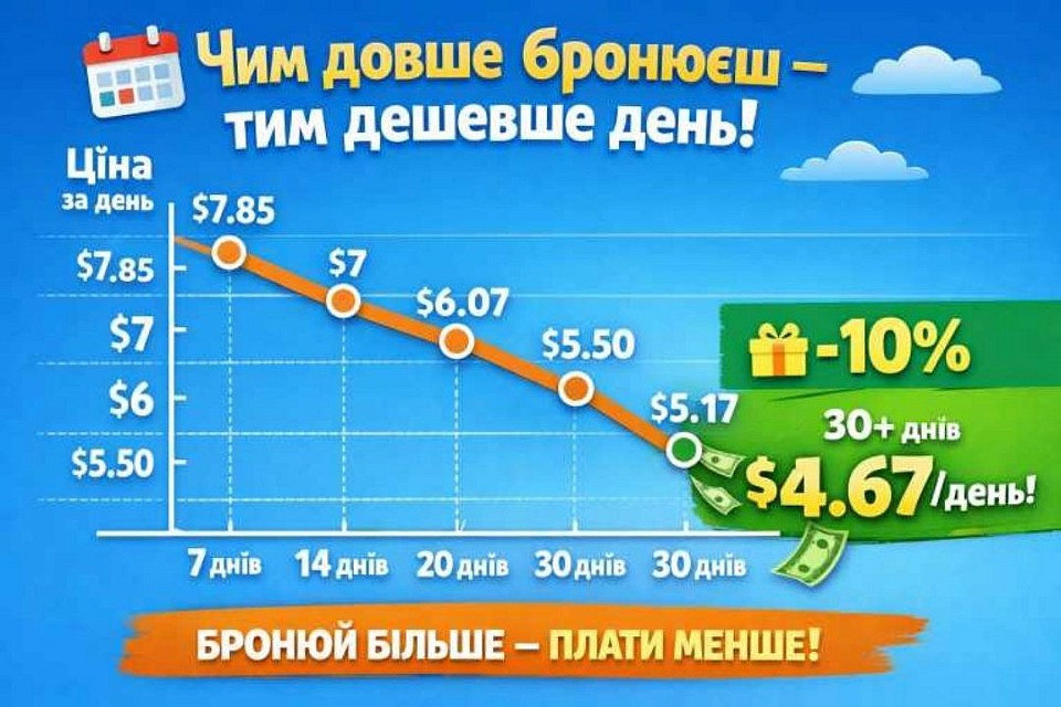 🎁 Знижка -10% при бронюванні на 30 днів і більше - 140 $ ≈ 129 € (~6400 грн)